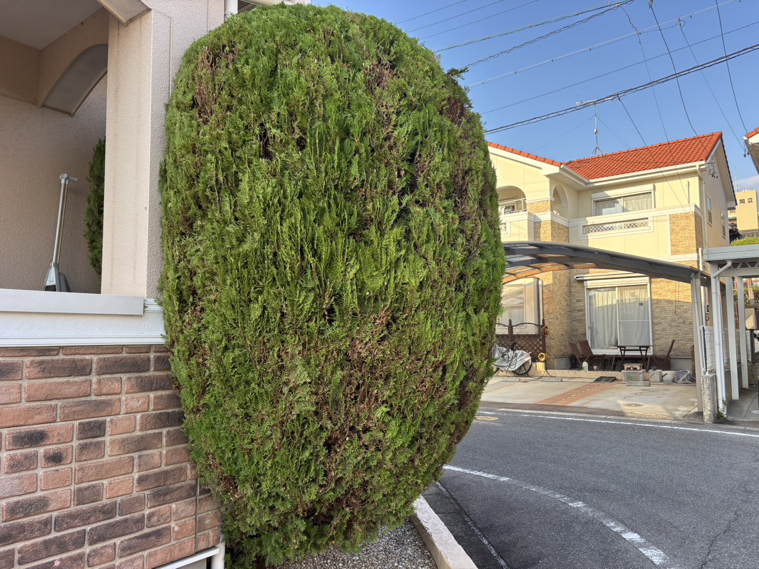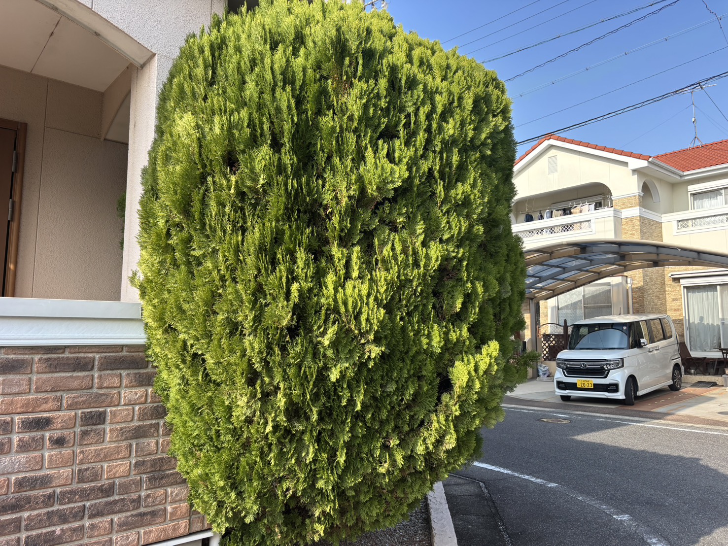 知立市逢妻町にて、お庭のキンモクセイとコノデガシワの刈り込み剪定を行いました。 玄関先に植えられたコノデガシワは、古くなった葉を丁寧に取り除き、風通しを良くすることで病害虫の予防にもつながるよう配慮しました。 また、キンモクセイは形を整えながらしっかりと刈り込み、美しい樹形に仕上げました。