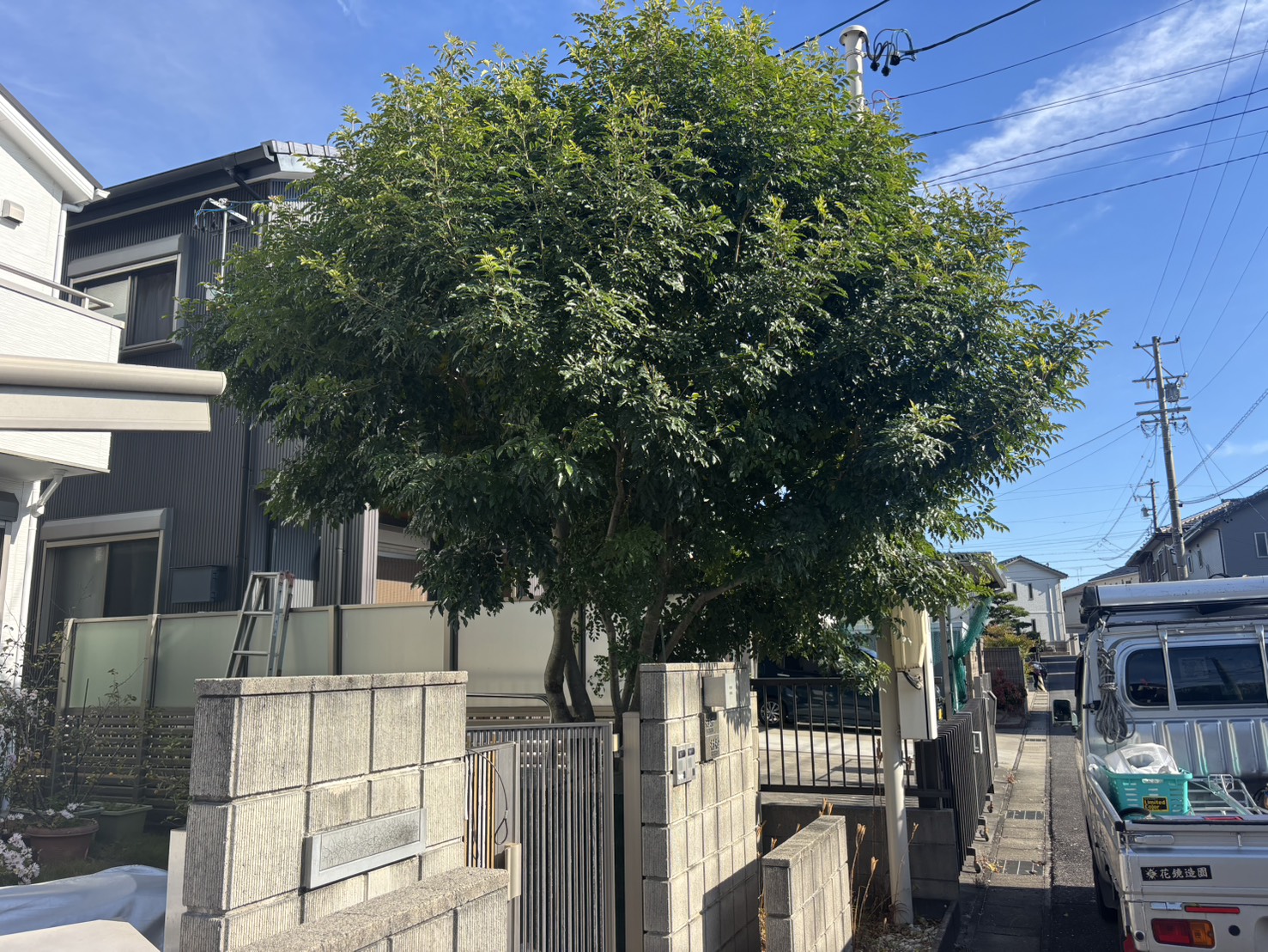 安城市里町にて、玄関まわりのシマトネリコの剪定を行いました。春に一度剪定をしていましたが、成長が早く枝葉が広がってきたため、再度のご依頼です。見た目の印象と出入りのしやすさ、風通しを意識しながら、全体のボリュームを抑えた透かし剪定で樹形を整えました