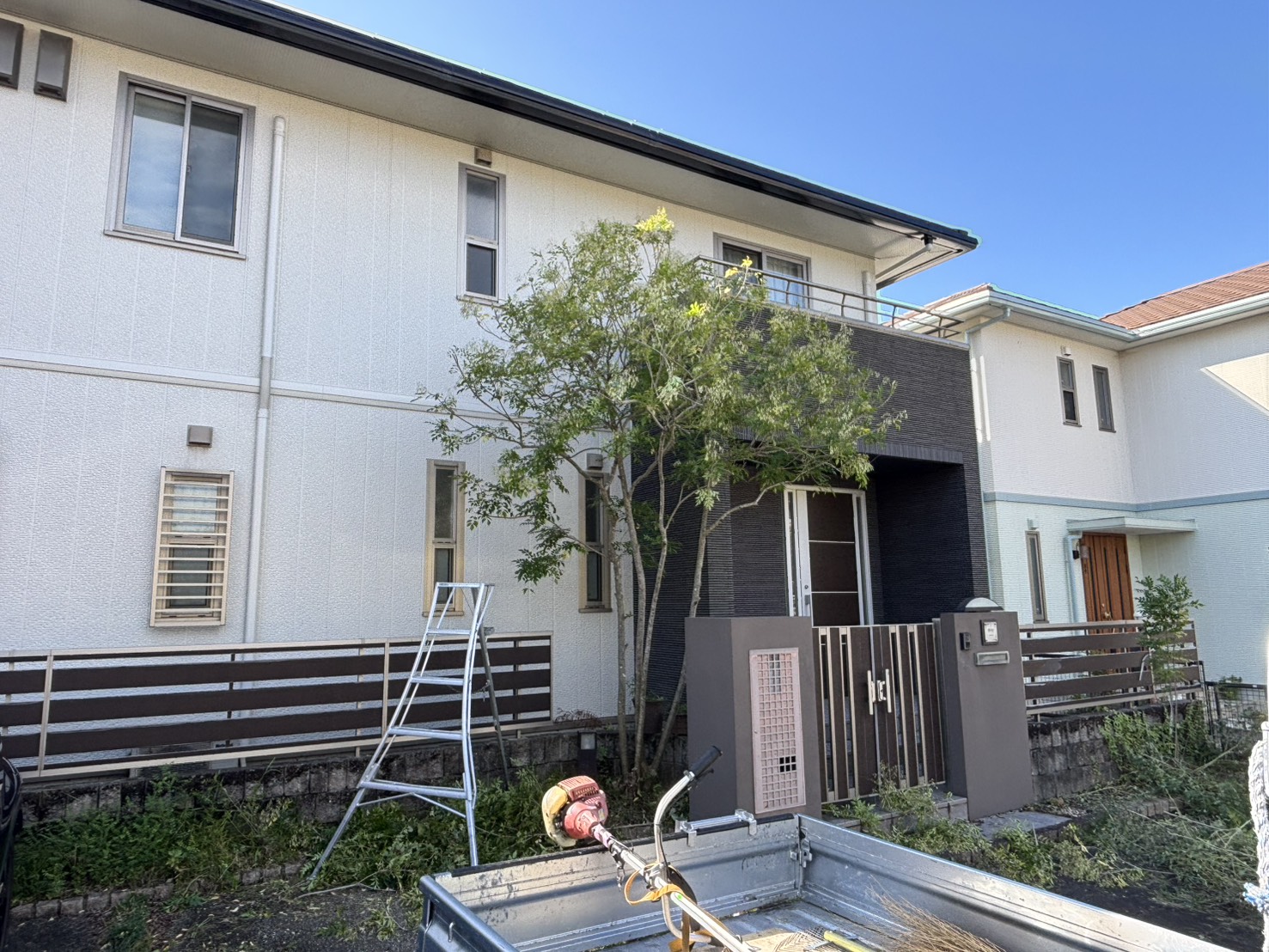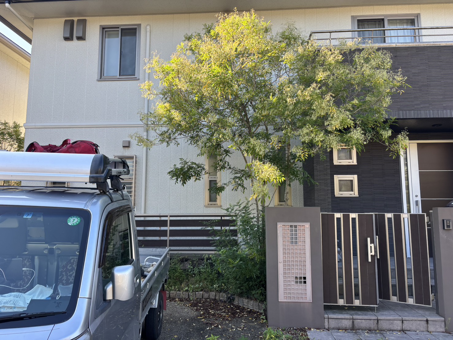 岡崎市細川町の個人邸にて、2年連続でご依頼いただいているお客様のお庭をお手入れしました。今回は、シンボルツリーであるシマトネリコの剪定、駐車場の草刈り、ご自宅周辺およびお庭全体の草刈りを実施。丁寧な仕