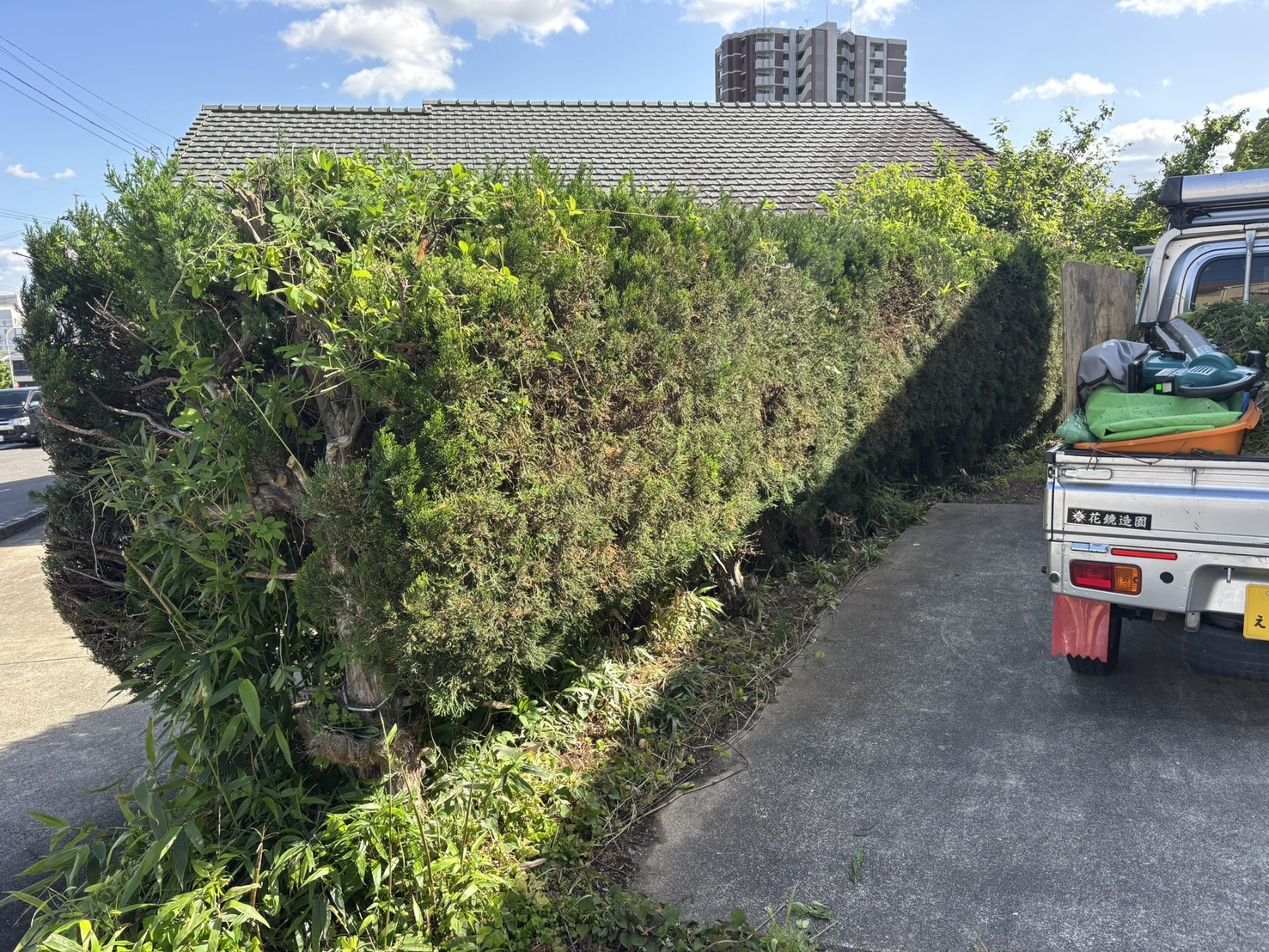 【豊田市日南町|個人邸】カイヅカイブキの生垣剪定|形を整え風通しを改善