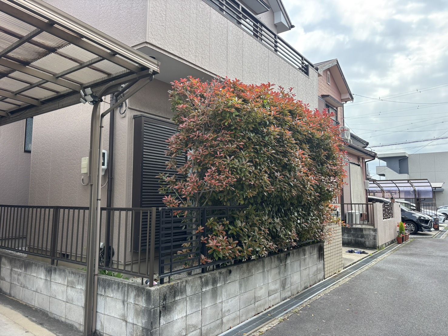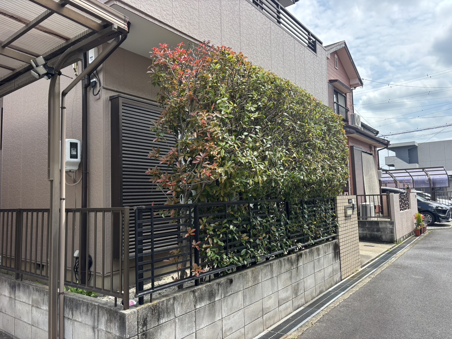 岡崎市森越町の個人邸にて、アカメモチ(レッドロビン)の刈り込み剪定を行いました。 こちらのお客様は今回で 3年連続のご依頼となり、毎年お庭の管理を任せていただいています。アカメモチは成長が早く、放置すると