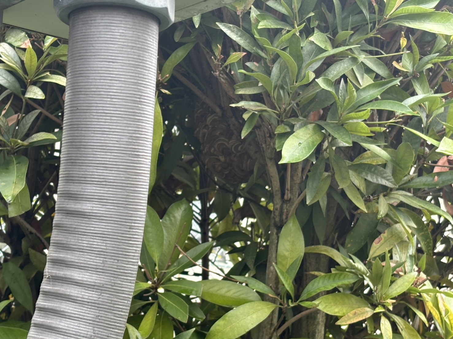「小学校の校門前にある駐車場の植え込みにスズメバチの巣がある」とのご連絡を受け、児童の安全を最優先に緊急対応いたしました。 最短日程で駆除スケジュールを調整し、下校時刻後に作業を実施。人通りの多い場所でも、安全対策を徹底したうえで、迅速かつ確実に駆除を完了しました。