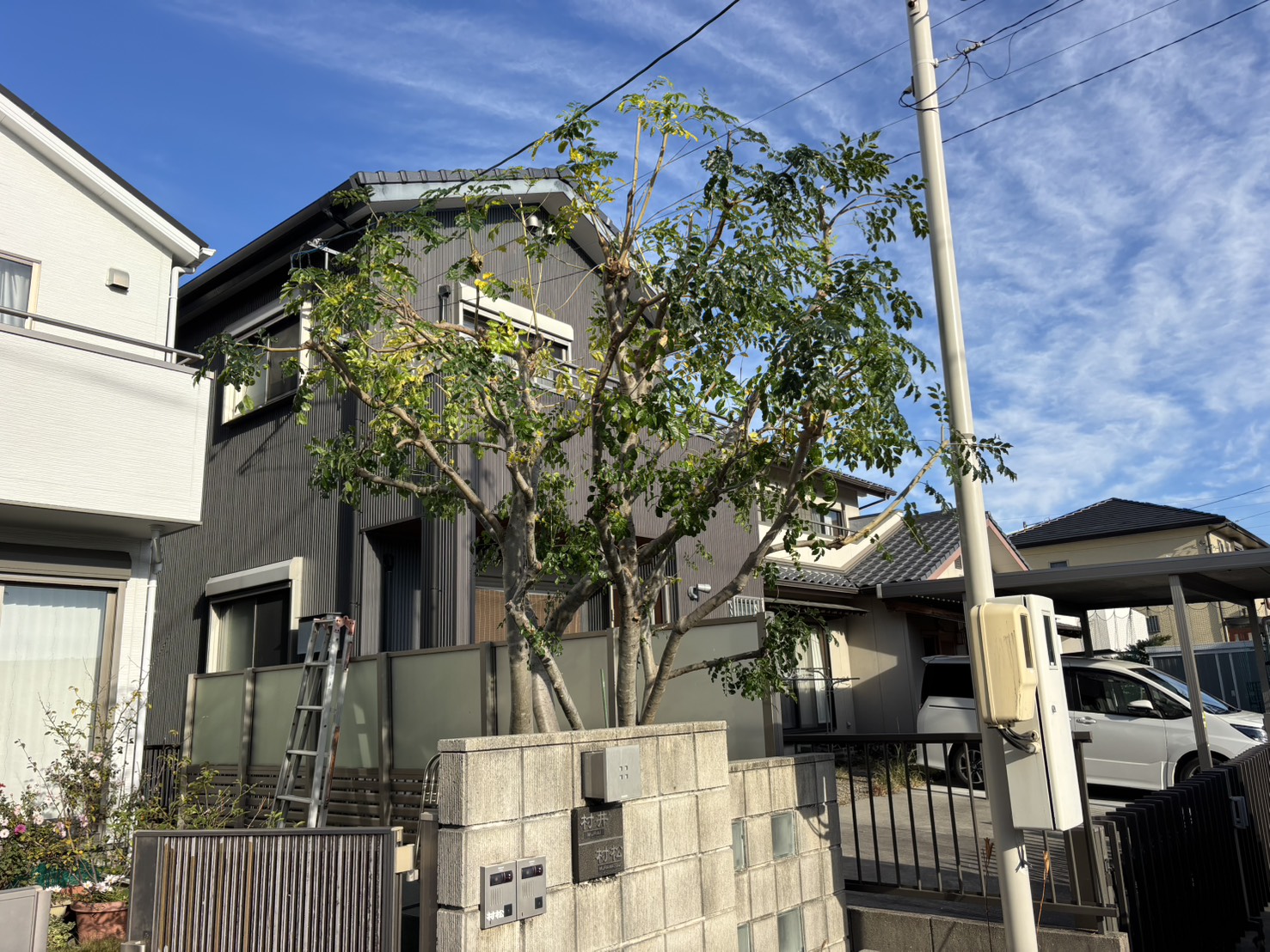 安城市里町にて、玄関まわりのシマトネリコの剪定を行いました。春に一度剪定をしていましたが、成長が早く枝葉が広がってきたため、再度のご依頼です。見た目の印象と出入りのしやすさ、風通しを意識しながら、全体のボリュームを抑えた透かし剪定で樹形を整えました